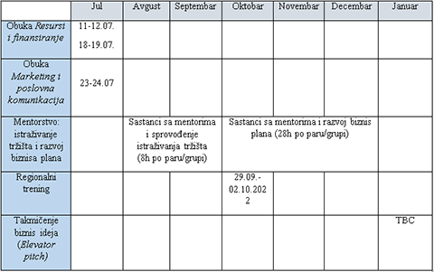 - Istraživanje potreba tržišta i razvoj biznis planova uz mentorsku podršku iskusnih preduzetnika i preduzetnica (avgust- decembar);
